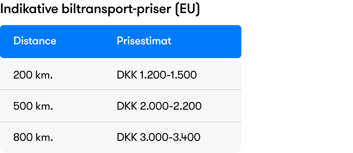 Typisk koster biltransport inden for Europa mellem €200 og €1.500. For eksempel ligger prisen på transport af en almindelig sedan fra København til Berlin omkring €400, mens samme transport til Rom vil koste cirka €500. Bemærk, at dette er vejledende priser, og at de faktiske pris kan variere.